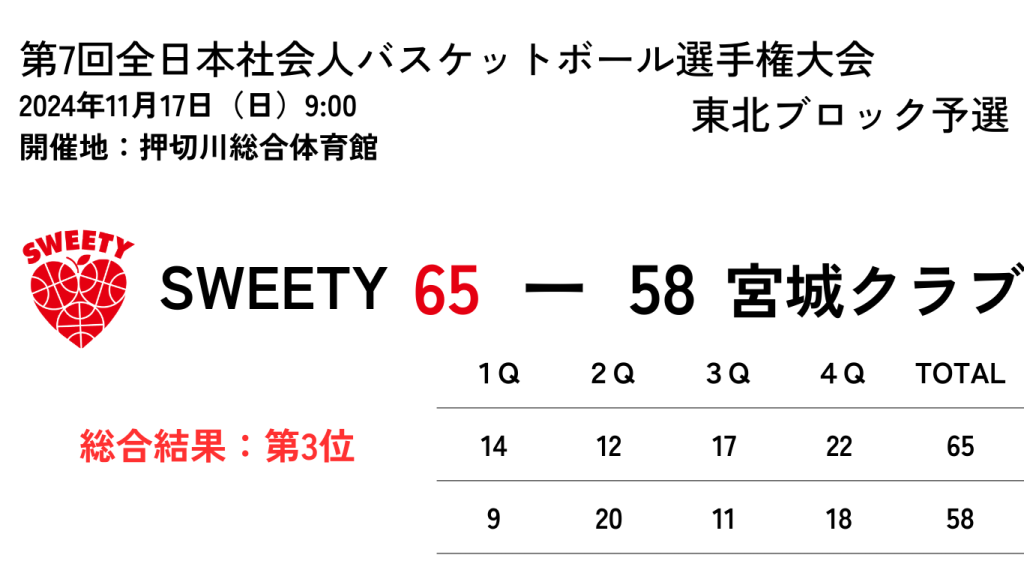| 11月15日 | 三井住友海上 86-74 | WIN YouTube🔗 |